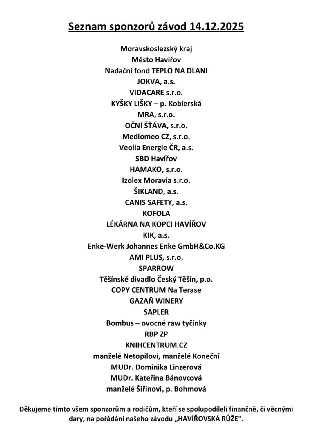 Děkujeme tímto všem sponzorům a rodičům, kteří se spolupodíleli finančně či věcnými dary na pořádání našeho závodu "HAVÍŘOVSKÁ RŮŽE".